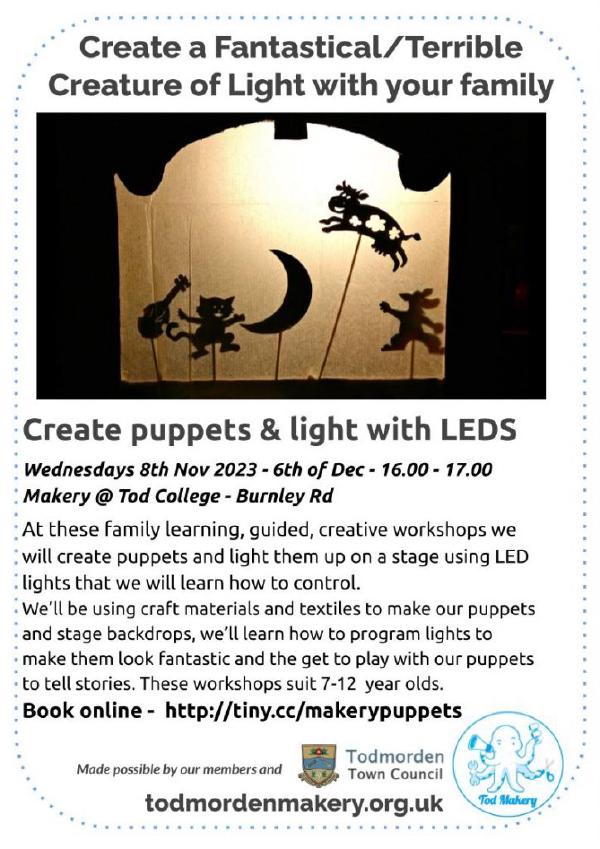 Building LED powered puppets and mini-stage lighting to put on a show. These sessions mix craft skills, art practices, storytelling and some elements of programming LED lights. The process can be open in scope or themed around stories concerning environmental or social issues.
